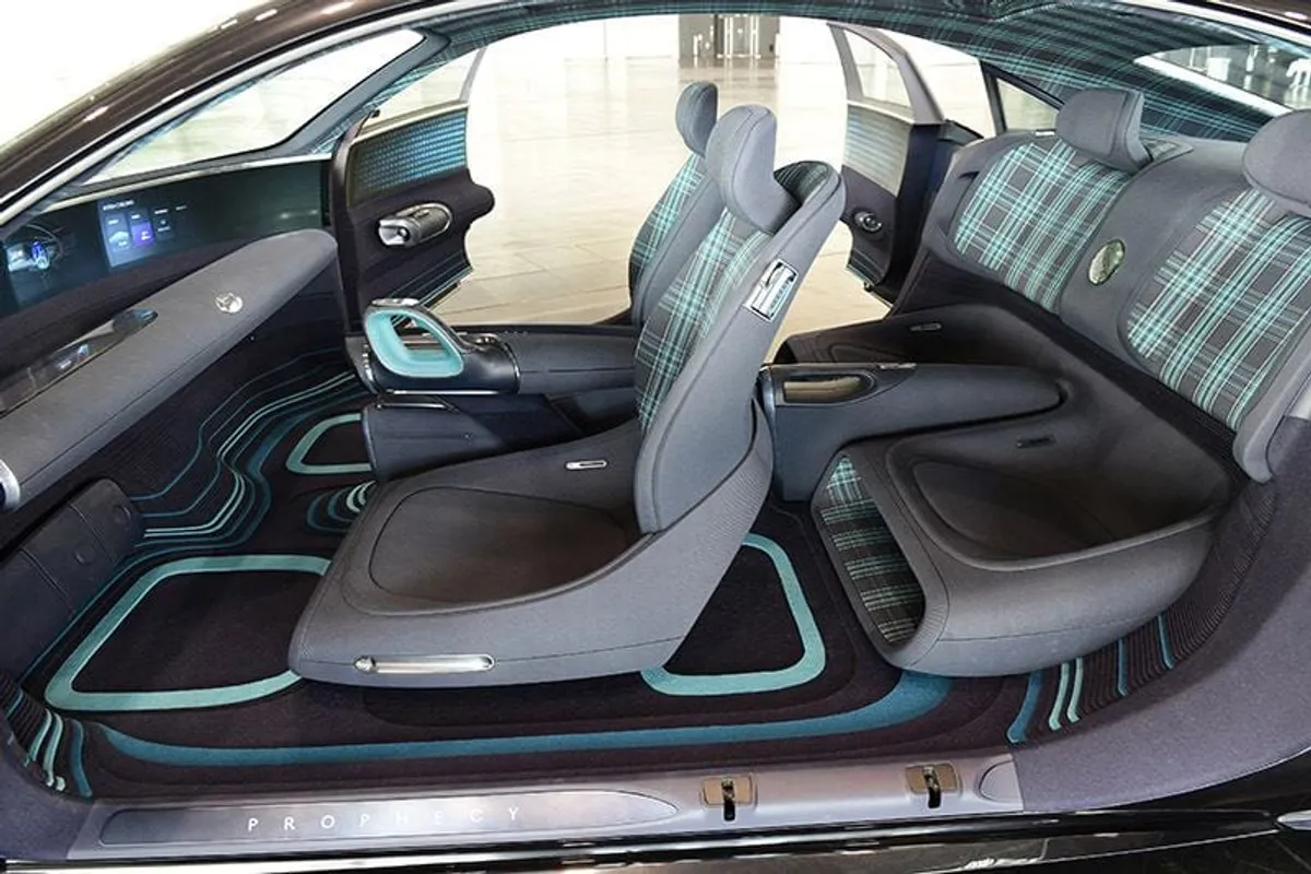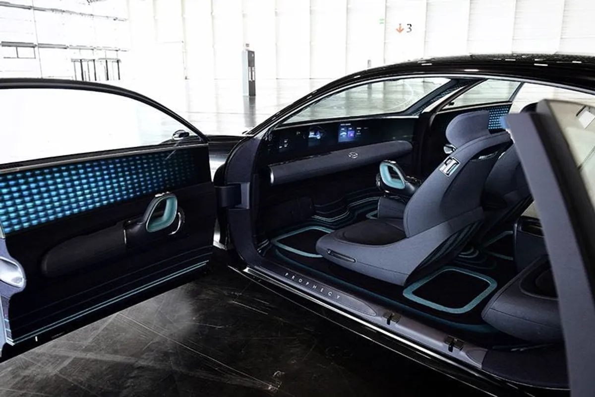 De concept car van Hyundai is ontwikkeld volgens de designfilosofie ‘Sensuous Sportiness’. De concept car is geïnspireerd op oldtimers uit de jaren 20 en 30. De Prophecy onderscheidt door de vloeiende lijnen en rondingen. Hyundai heeft bij de concept car in de koplampen, achterlichten en spoiler gebruik gemaakt van pixelverlichting. Dit geeft een ontzettend gaaf effect. Het gestroomlijnde design van de concept car zorgt voor een lage luchtweerstand, wat een positief effect heeft op een elektrische auto. Als we kijken naar het interieur, valt het meteen op dat het stuurwiel ontbreekt. Het stuurwiel is vervangen voor twee joysticks. Een joystick zit in het portierpaneel, de andere joystick zit in het middenconsole. Hyundai geeft aan dat de auto hiermee intuïtiever te bedienen en te rijden is. Het ziet er in ieder geval heel futuristisch uit. Net zoals het digitale scherm, dat zich over het hele dashboard bevindt.
